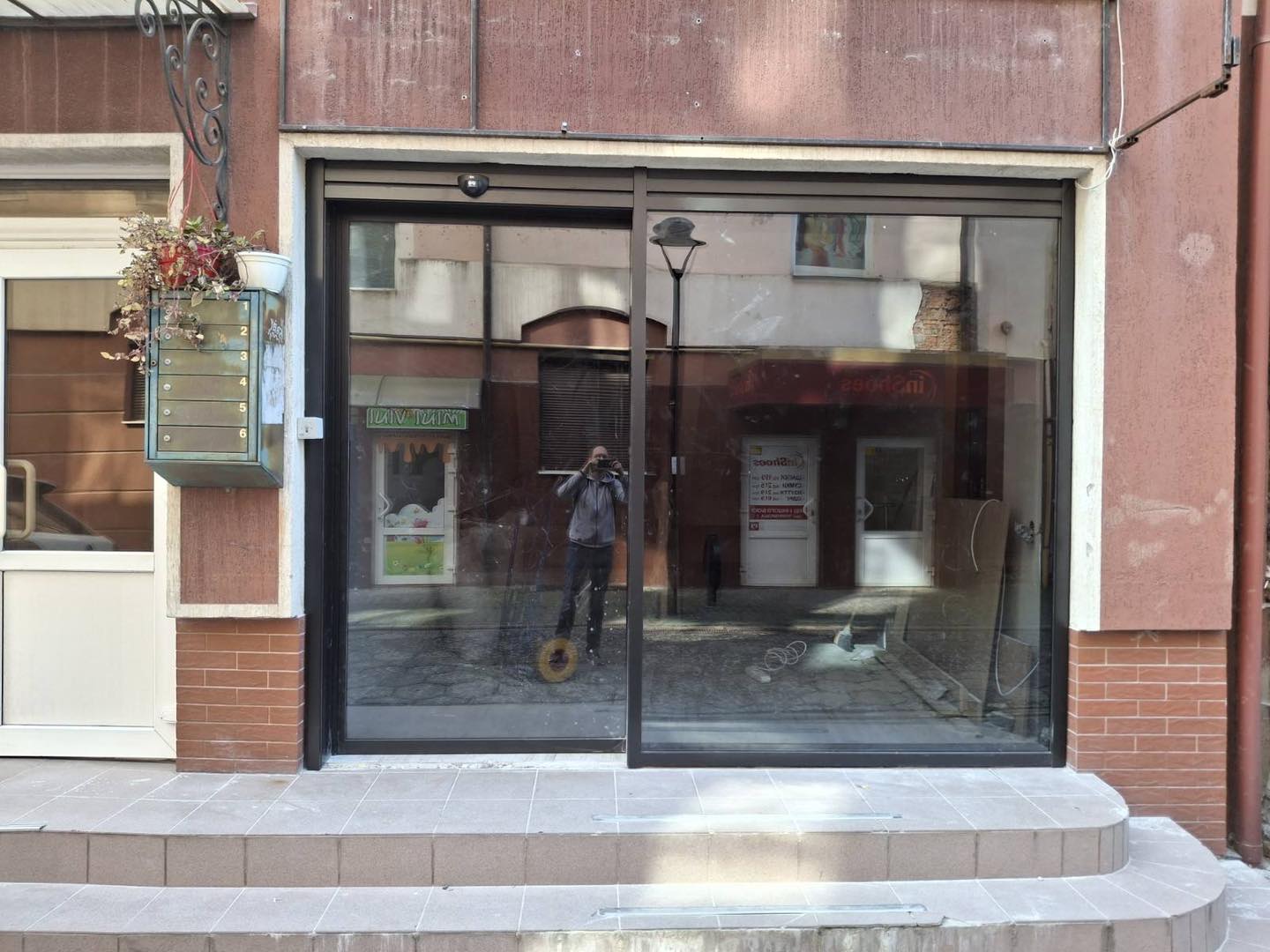 Вітраж з автоматичними дверима. Склопакети з теплими чорними рамками і зовнішнім склом графіт.